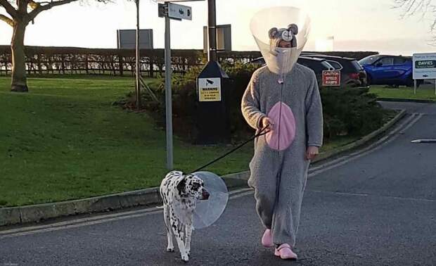 Though you can imagine the tactic being used by pediatricians, Mike Farrell had a hunch that donning the huge grey and pink onesie-style outfit would be a big help with Rupert the Dalmatian, who needed an operation on his leg last week.