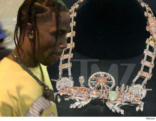 We’re told Travis dropped around $450,000 on this incredibly detailed chain and pendant. It’s pretty much the bling equivalent of his concert layout, complete with his mug in the middle of a Ferris wheel and the tracks of his roller coaster stage design.