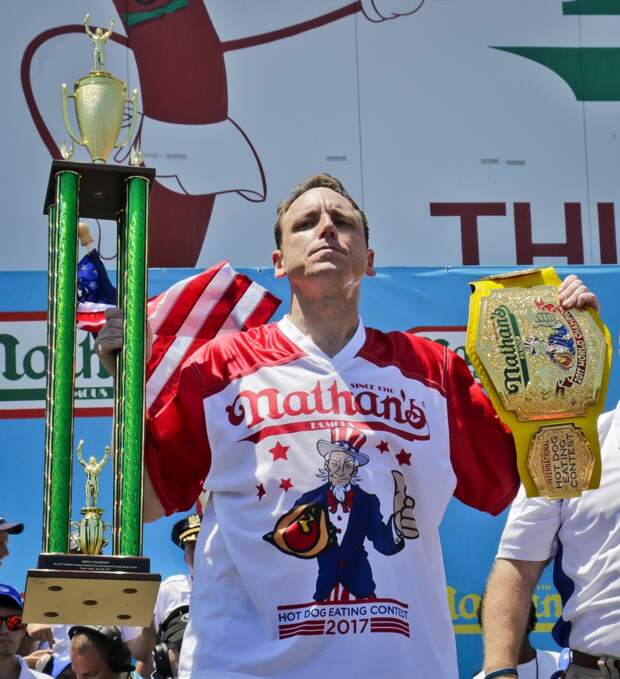 Joey “Jaws” Chestnut has broken his own record to extend his reign as chowing champion at the annual July Fourth hot dog eating contest at Nathan’s Famous in New York.