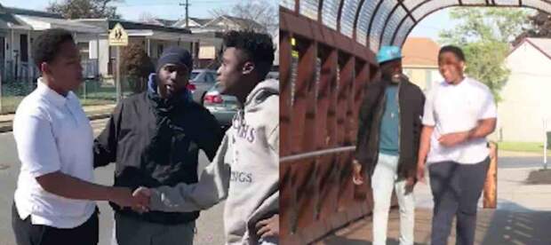 Their peers can be heard egging them on and encouraging them to fight.Suddenly, Ibn Ali Miller marches up to the group, steps into the middle of the fight, and demands that the youths stop exchanging blows.