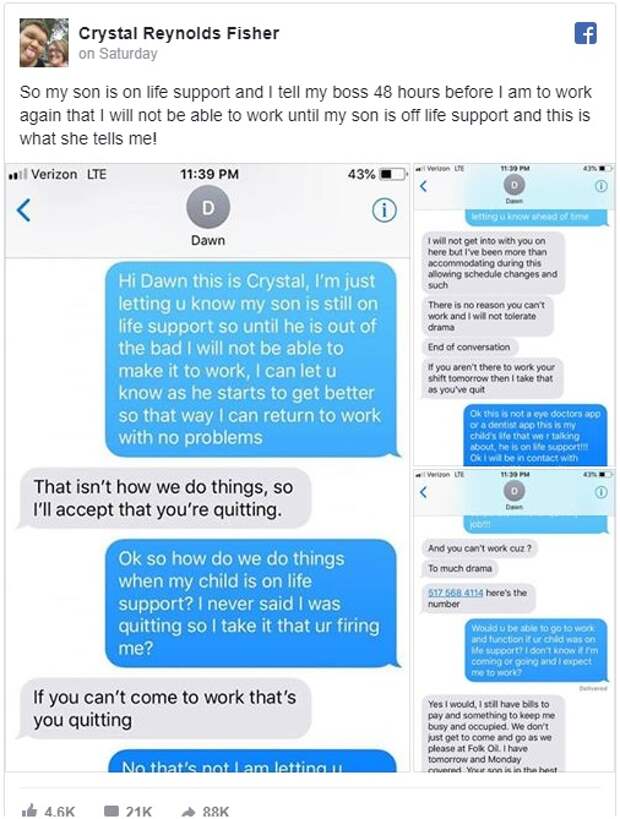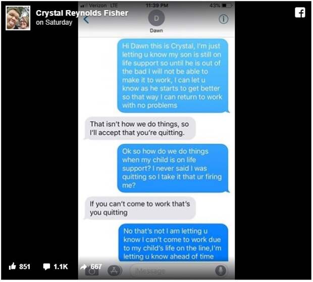 After her manager – identified as a woman named Dawn – refused to give her time off to be with her son (who, again, was on freakin’ life support!) despite the fact that she gave 48 hours notice, Crystal posted their exchange to Facebook, where it quickly went viral.