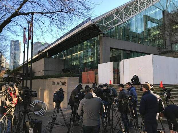 Journalists outside the courthouse in Vancouver, British Columbia, where Meng Wanzhou, the chief financial officer of Huawei, appeared for a bail hearing on Friday. David Ryder/Reuters