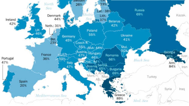 All eight are in Eastern Europe.- Greece (89%)