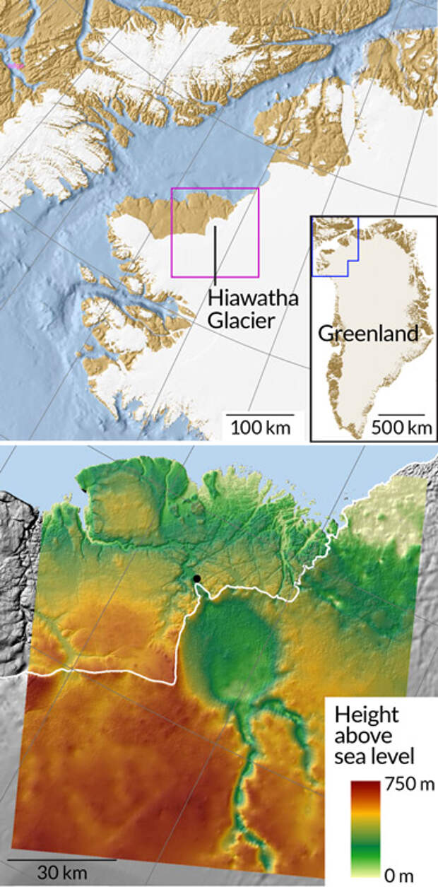 Members of the research team first spotted a curiously rounded shape at the edge of Hiawatha Glacier in northwest Greenland in 2015, during a scan of the region by NASA’s Operation IceBridge. The mission uses airborne radar to map the thickness of ice at Earth’s poles.