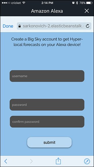 A web browser will open up and take you to the Blue Sky website, where you’ll need to create an account real quick and enter in some details to get the weather. So start by scrolling down and tapping “Create One!”.