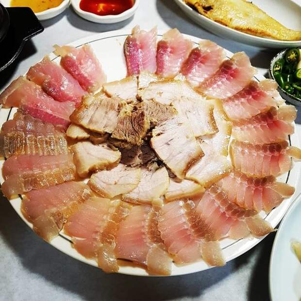 Like Icelandic hákarl, Korean hongeo—or fermented skate—excretes uric acid through its skin. South Koreans capitalize on this pungent, natural preservative by serving the creature as aged sashimi. Accompanied by boiled pork belly and kimchi, hongeo becomes part of a culinary trinity known as samhap.