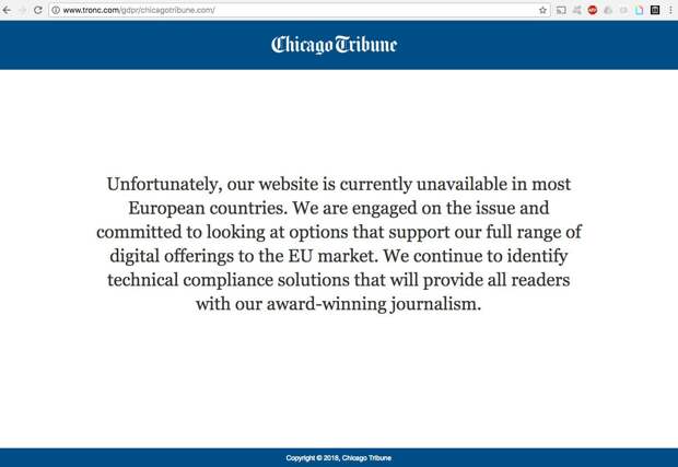The most notable blackouts were by news organizations tied to the American media company Tronc. In addition to The Chicago Tribune and Los Angeles Times, newspapers including The New York Daily News, The Orlando Sentinel and The Baltimore Sun were also unavailable to readers in Europe. (Tronc announced in February that it was selling The Los Angeles Times.)