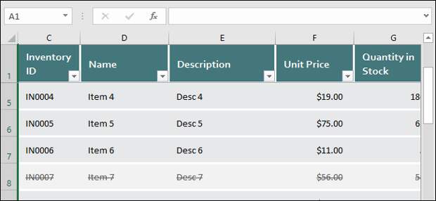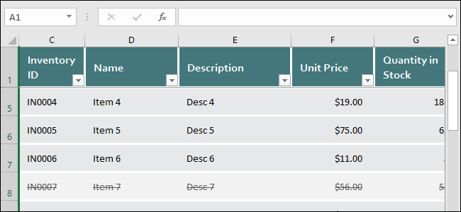 In our example, it lets us keep the inventory ID column visible while we scroll through the other columns of data.