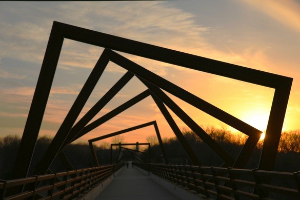 A 25-mile trail winds its way through five Iowa towns, from Woodward to Ankeny, with a dramatic crossing over the Des Moines River Valley. The High Trestle Trail Bridge is half a mile long and 130 feet high, and is said to be among the largest trail bridges in the world.