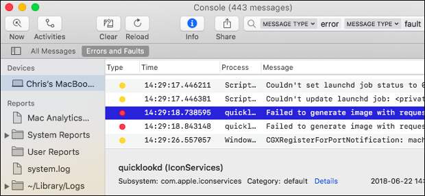 By default, you’ll see a list of console messages from your current Mac. You can click “Errors and Faults” in the toolbar to see only error messages, if you like. You can also use the search box to search for a type of error message you want to see.