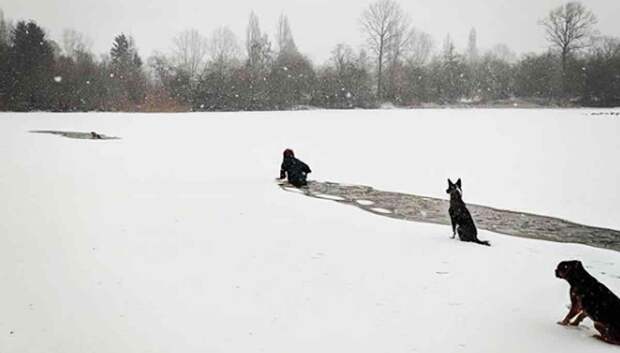 As pedestrians panicked and tried to call the dog and coax him to crawl back out of the water, one woman simply started breaking the ice with her hands and making her way out to…