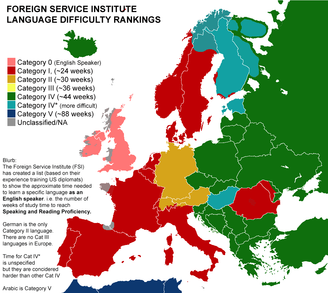 This map shows how the FSI judges the difficulty of European languages. Note that the Institute only teaches languages that are required for diplomatic intercourse; hence the grey spots on the map.