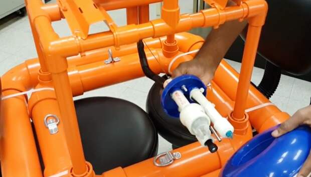 Flotation is provided by a framework of sealed 3/4″ and 3″ PVC pipes that look strong enough to protect the electronics from a casual boat-bump. High above the water (under ideal conditions) there is the waterproof control box, packing two Arduino UNOs…