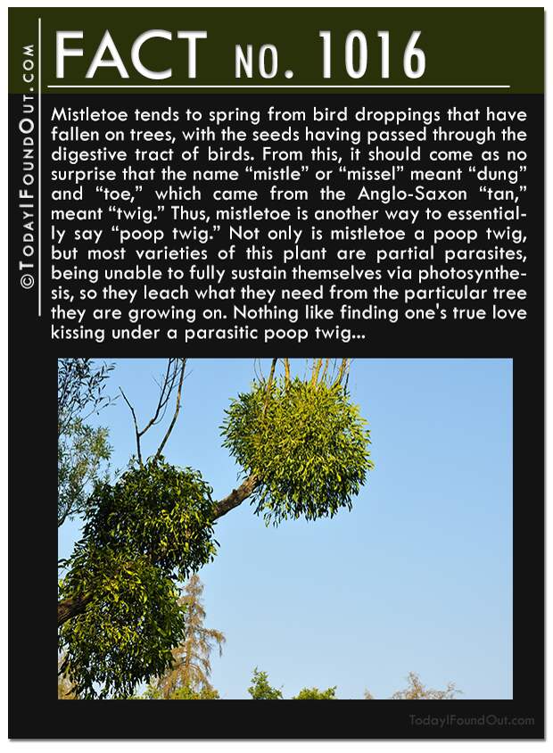 1016: Mistletoe tends to spring from bird droppings that have fallen on trees, with the seeds having passed through the digestive tract of birds. From this, it should come as no surprise that the name “mistle” or “missel” meant “dung” and “toe,” which came from the Anglo-Saxon “tan,” meant “twig.