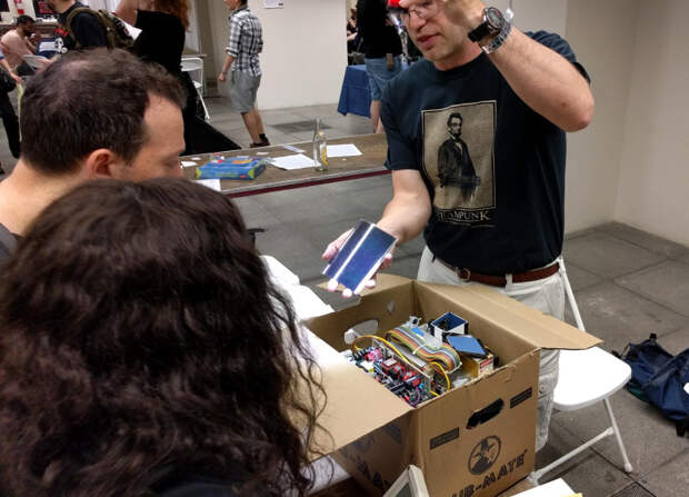 Prior to this weekend I had assumed making holograms to be beyond the average hacker’s reach, either in skill or treasure. I was proven wrong by a Club-Mate box full of electronics, and an acrylic jig perched atop an automotive inner tube. At the Hope Conference, Tommy Johnson was sharing his hacker holography in a workshop that let a few lucky attendees make their own holograms on site!