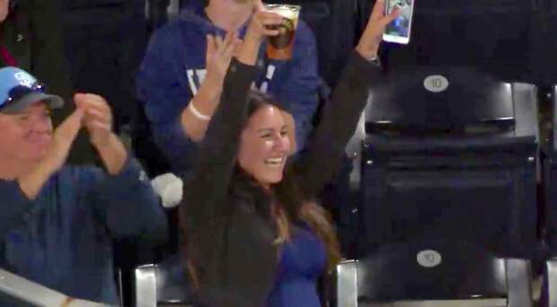 At first, she thought that the ball had landed in the row behind her – but then she realized that the pitch had bounced off of one of the chairs and plopped directly into her cup of beer.