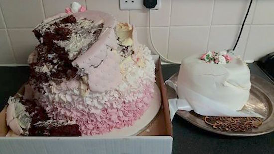 “I had baked, secured, dowelled and decorated my own cake and we were quite cautious to drive carefully,” Millie wrote on Facebook. “However, when we arrived and opened the cake box it appeared that the hot weather caused the buttercream to melt and the cake just gave up.”