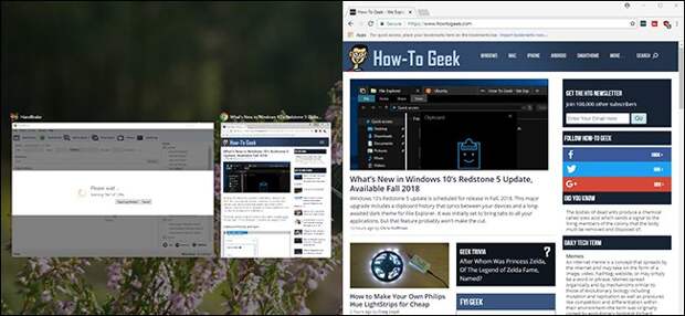 In Windows dragging a window to the corner or sides of your display quickly “snaps” it into place. Drag it to the left or right edge, and the window snaps to a position where it takes up half the screen. Better yet, Windows immediately shows all your other open windows so you can choose one to take up the other half of the display.