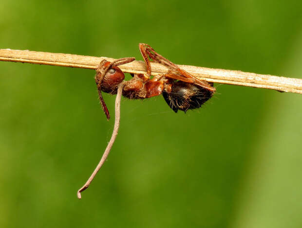 By now you may have heard its famous tale. A parasitic fungus, known as Ophiocordyceps, invades an ant’s body, growing through its tissues and soaking up nutrients. Then it somehow orders its host to march out of the nest and up a tree above the colony’s trails. The fungus commands the ant to bite onto the vein of a leaf, then kills the thing and grows as a stalk out of the back of its head, turning it into a shower head raining spores onto victims down below.That’s how it all goes down in South American forests, where Loreto had already spent plenty of time. But the zombie she found on her hike in Japan was different. First of all, the fungus had driven it higher up a tree. And two, it hadn’t bitten onto a leaf, but had wrapped itself around a twig, hanging upside down.
