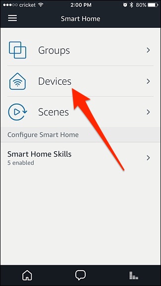 On this screen there are four sections: Groups, Devices, Scenes, and Smart Home Skills. Start off by tapping on “Devices”.