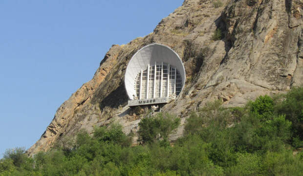 With a bonnet-like facade protruding from the face of a cliff along a sacred mountain, this location would have been the perfect setting for a Bond villain, if Soviet movie…