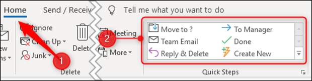 You can find Quick Steps on the “Home” tab of Outlook. When you first start, you’ll see the default Quick Steps there. You can click any of them to apply the included actions to a selected message.