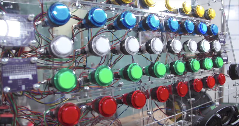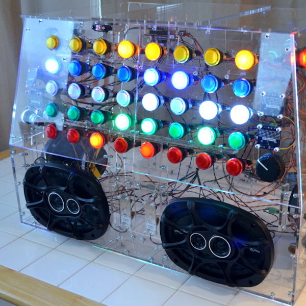 The Monolith consists of a clear acrylic box covered in LED-lit arcade buttons.