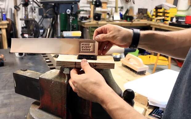 The real action is when he has the 3D print completed. He glues the stamp down to some wood and then fits the assembly to a vise that he’ll use…