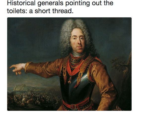 This is pretty silly. Have you ever noticed how many military portraits have a commander pointing into the distance? The idea is that he’s going to lead his forces in that direction. Oxford historian Dr. Jonathan Healey imagines that they are pointing their men to the nearest toilet in unfamiliar territory, or instructing them to go over there to do their business.