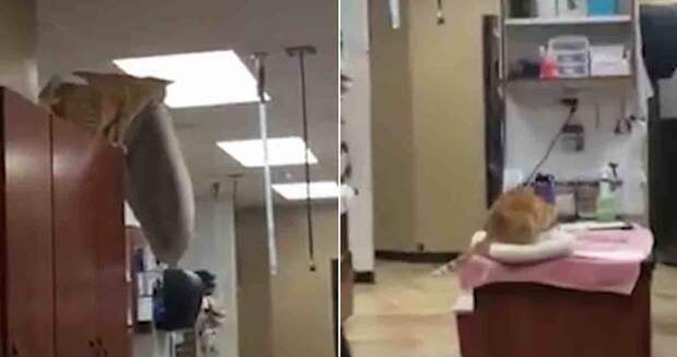 In a video that is being shared across the internet, a feline can be seen perched atop of a cabinet in a veterinary office with a kitty bed clutched in its mouth.