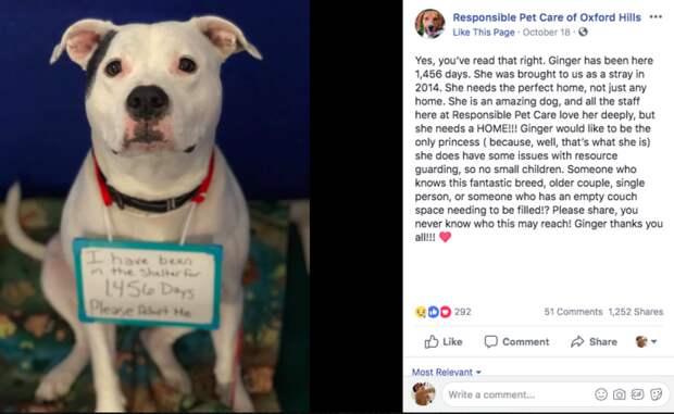 Ginger has gone viral after the organization wrote a Facebook post detailing how long she’s been looking for an adopter. The post includes a photo of Ginger appearing to look at the camera with pleading eyes, wearing a sign that says, “I…