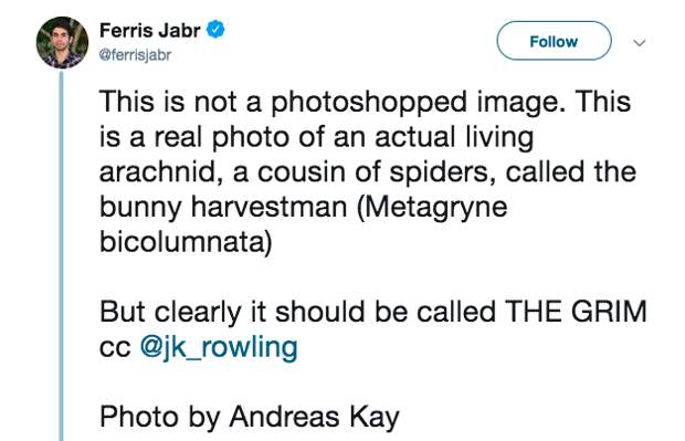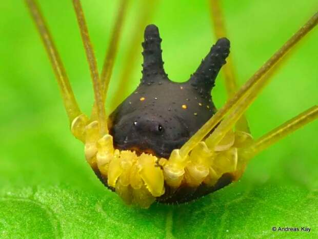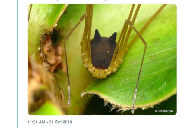 It’s called a Bunny Harvestman (omg why) and lives in the rainforests of Ecuador – it’s related to a spider, but isn’t technically one (because it’s even more of a horror show, I’m guessing).