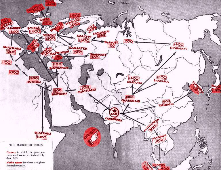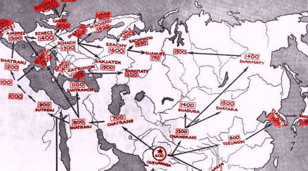 But its journey was considerably slower than the viral memes of our connected age, which shoot across the globe in mere minutes. It took chaturanga a thousand years to reach Iceland as skak.This map, taken from the endpapers of A Short History of Chess (1949) by Henry Alexander Davidson, shows the routes both to the east and west travelled by the game, the approximate dates when it reached various parts of the world, and the local names for the game.