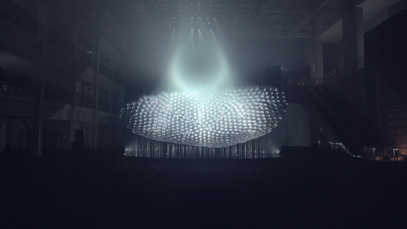 Presently installed at the ACT Center of Asia Culture Complex in Gwangju, South Korea, Light Barrier co-ordinates eight projectors, directing their light onto a concave cluster of 630 mirrors.