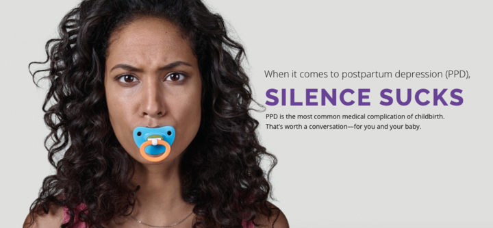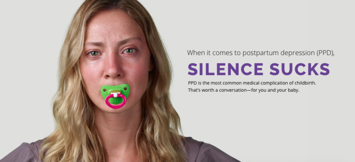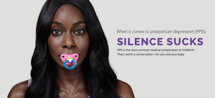 The ads feature photos of women sucking on pacifiers. The accompanying text reads, “When it comes to postpartum depression (PPD), Silence sucks. PPD is the most common medical complication of childbirth. That’s worth a conversation ― for you and your baby.”