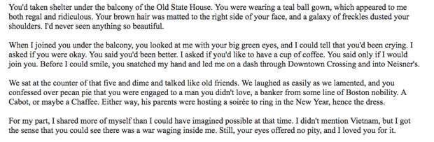 You’d taken shelter under the balcony of the Old State House. You were wearing a teal ball gown, which appeared to me both regal and ridiculous. Your brown hair was matted to the right side of your face, and a galaxy of freckles dusted your shoulders. I’d never seen anything so beautiful.
