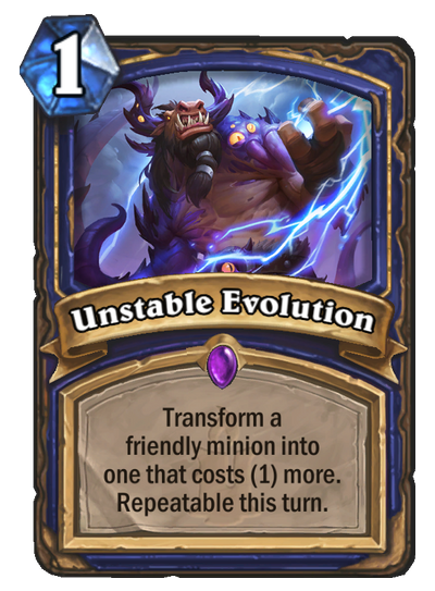 Unstable Evolution gives you some flexibility. As long as you have the mana, you can keep casting this spell. So if you don’t like the outcome of your evolution, you can try again. This idea of a “repeatable” spell is a new and interesting mechanic for Hearthstone.