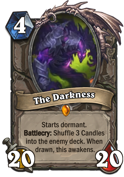 it starts dormant, meaning it has no attack or health as it takes up a spot on your board, and the enemy can’t remove or target it. The creature only turns into a 20/20 giant if your opponent draws three Candles, which are cards that you shuffle into their deck when you play The Darkness.The actual minion is not that great. It’s a lot of work to get the 20/20. Even if you…