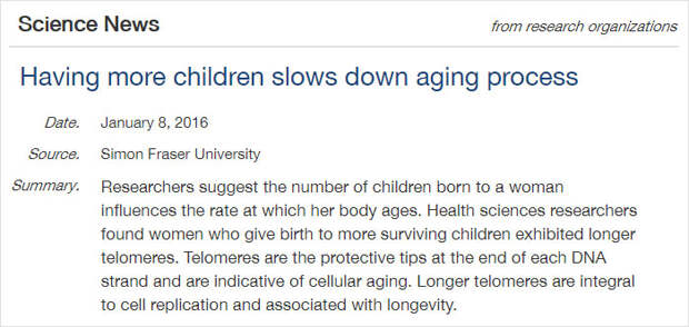 The study was published in Science Daily and was based on the examination of DNA strands in mothers. The researchers suggested in the paper that “the number of children born to a woman influences the rate at which her body ages,” and the results were positive. They found “women who give birth to more surviving children exhibited longer telomeres. Telomeres are the protective tips at the end of each DNA strand and are indicative of cellular aging. Longer telomeres are integral to cell replication and associated with longevity.”